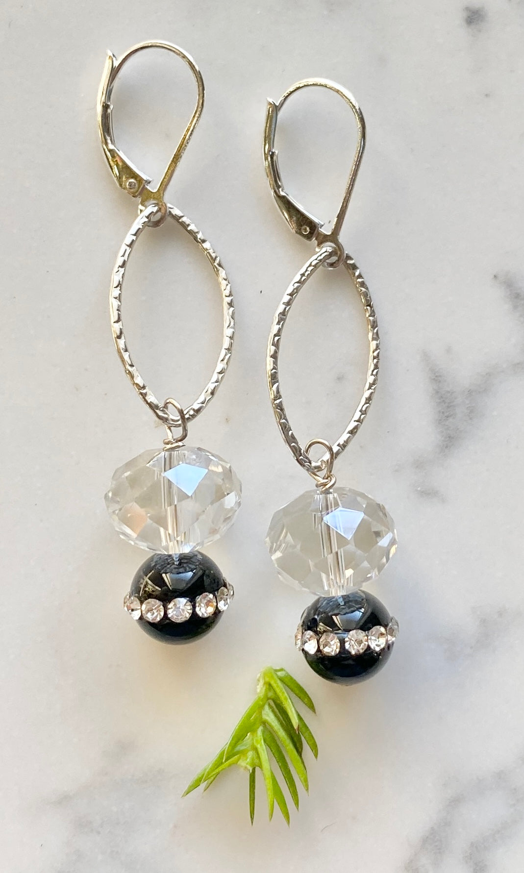 A beautiful black onyx ball has a line of crystals set into it, creating a stunning look. A sterling silver filled loop adds length and sets off the clear cut crystal beads. Lever back ear wires holds them secure.