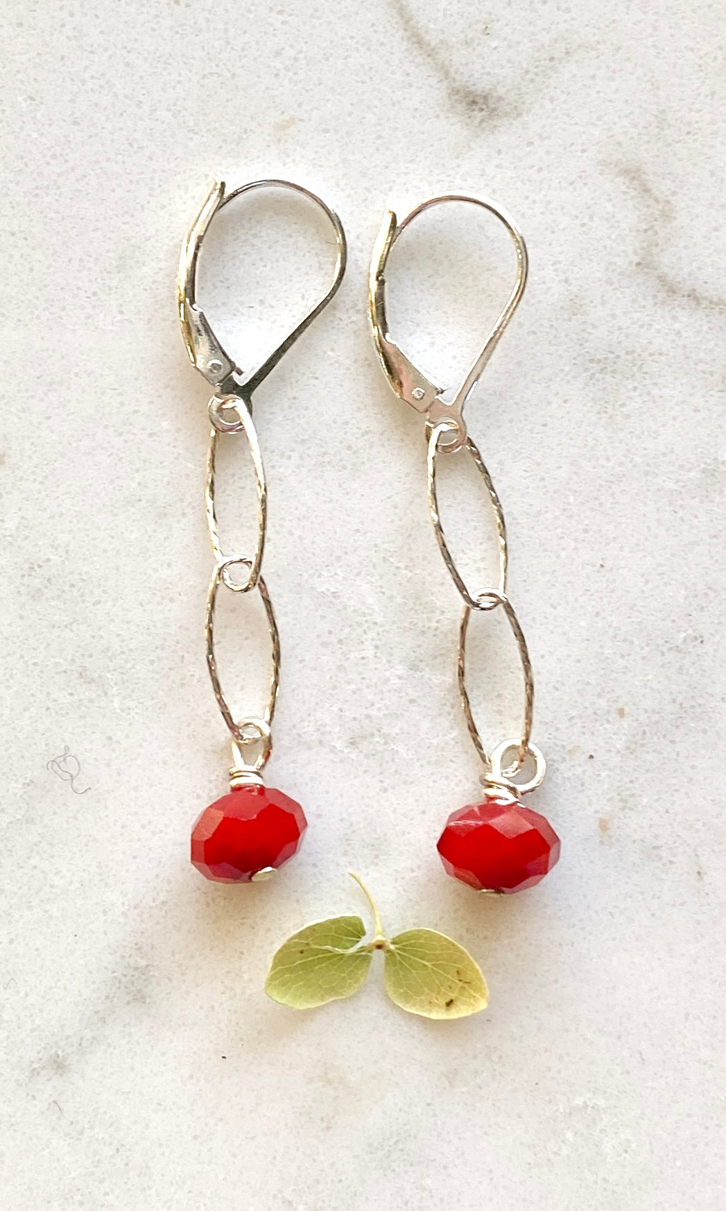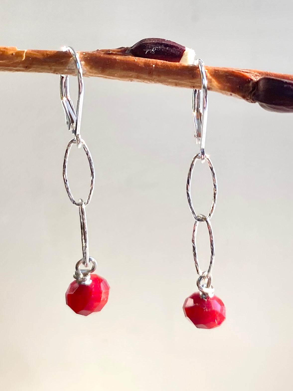 Beautiful shimmering diamond cut chain adds to the faceted red glass beads. Lever back ear wires hold them secure. Enjoy the fun!