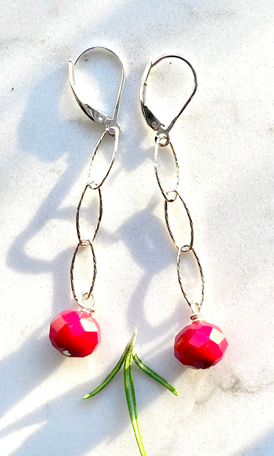 Beautiful shimmering diamond cut chain adds to the faceted red glass beads. Lever back ear wires hold them secure. Enjoy the fun!