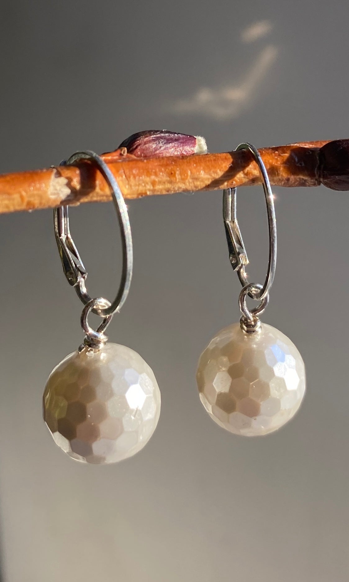 A pearl like coating coats a faceted bead creating a beautiful effect.  A sterling silver hoop lever back ear wire is the perfect addition to these beads. You will love the ease of getting these on and off and you will love the security too with the levers.